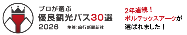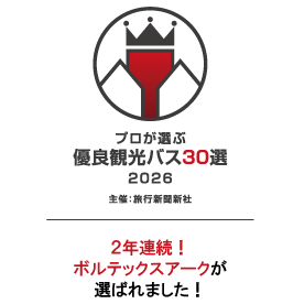 この度、第35回「プロが選ぶ優良観光バス30選」にボルテックスアークが2年連続選ばれました。(主催:株式会社旅行新聞新社、2025年12月11日発表)